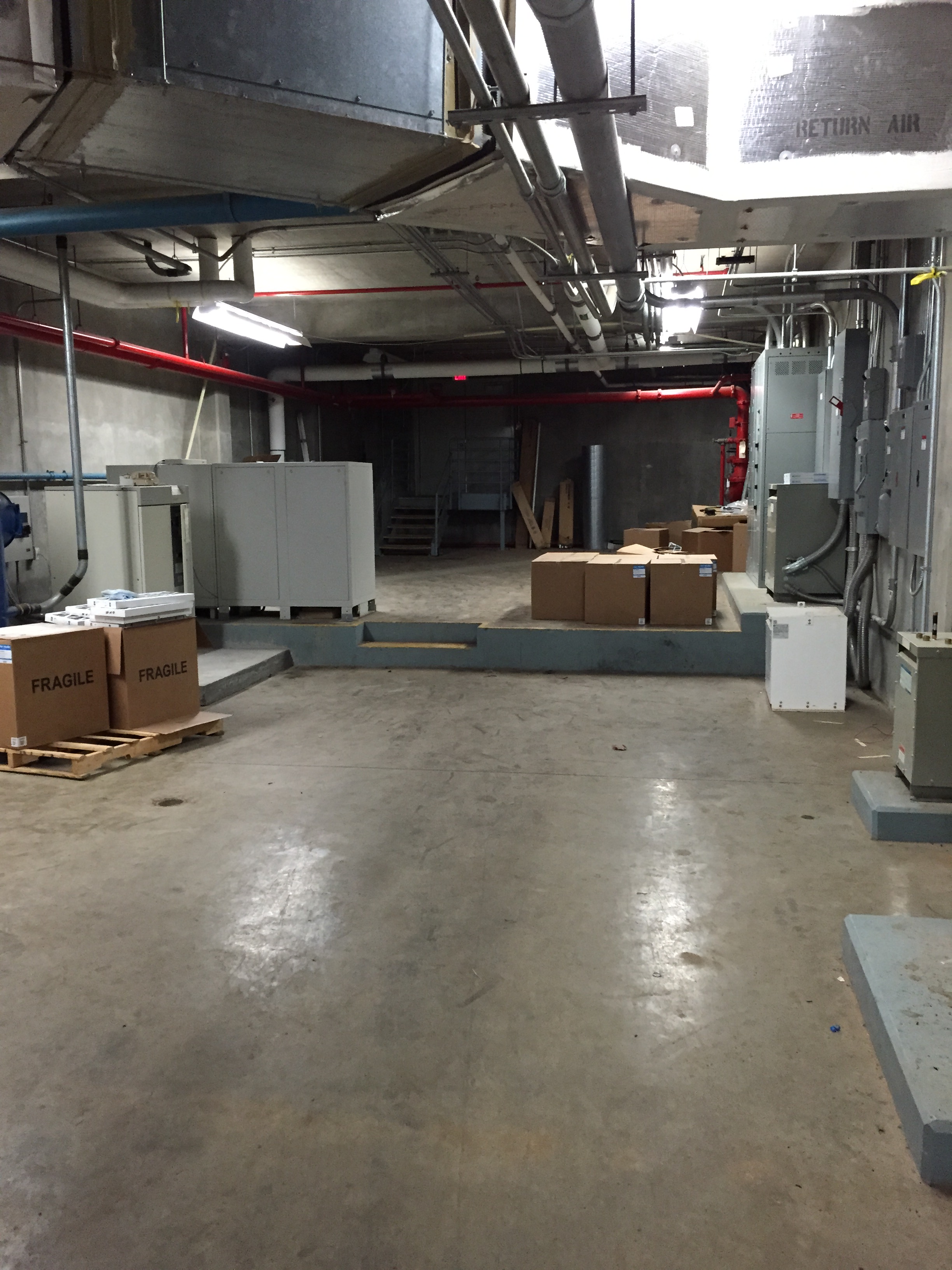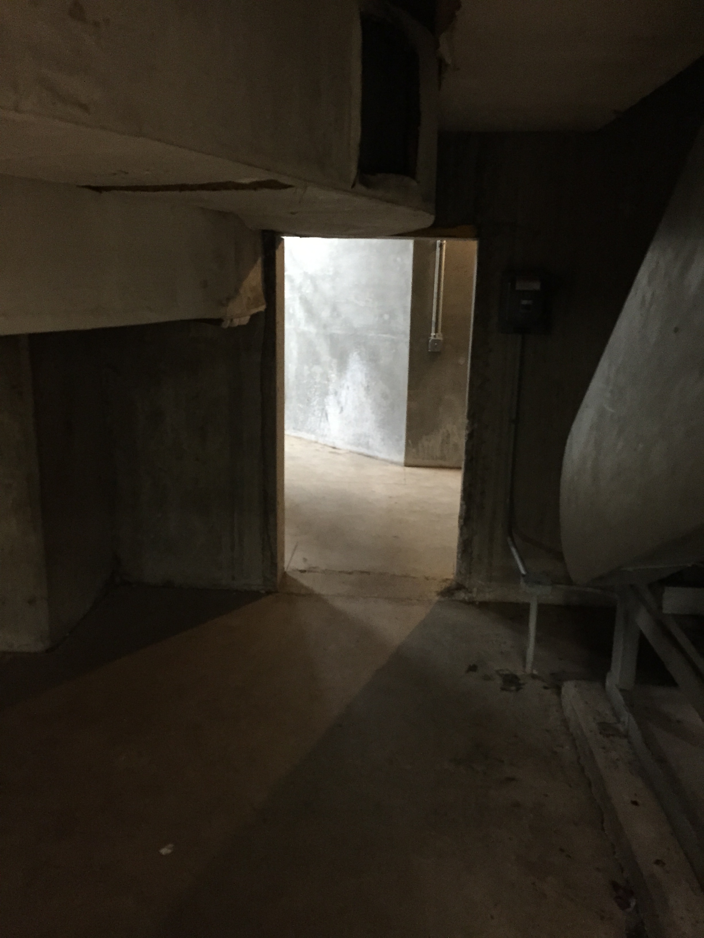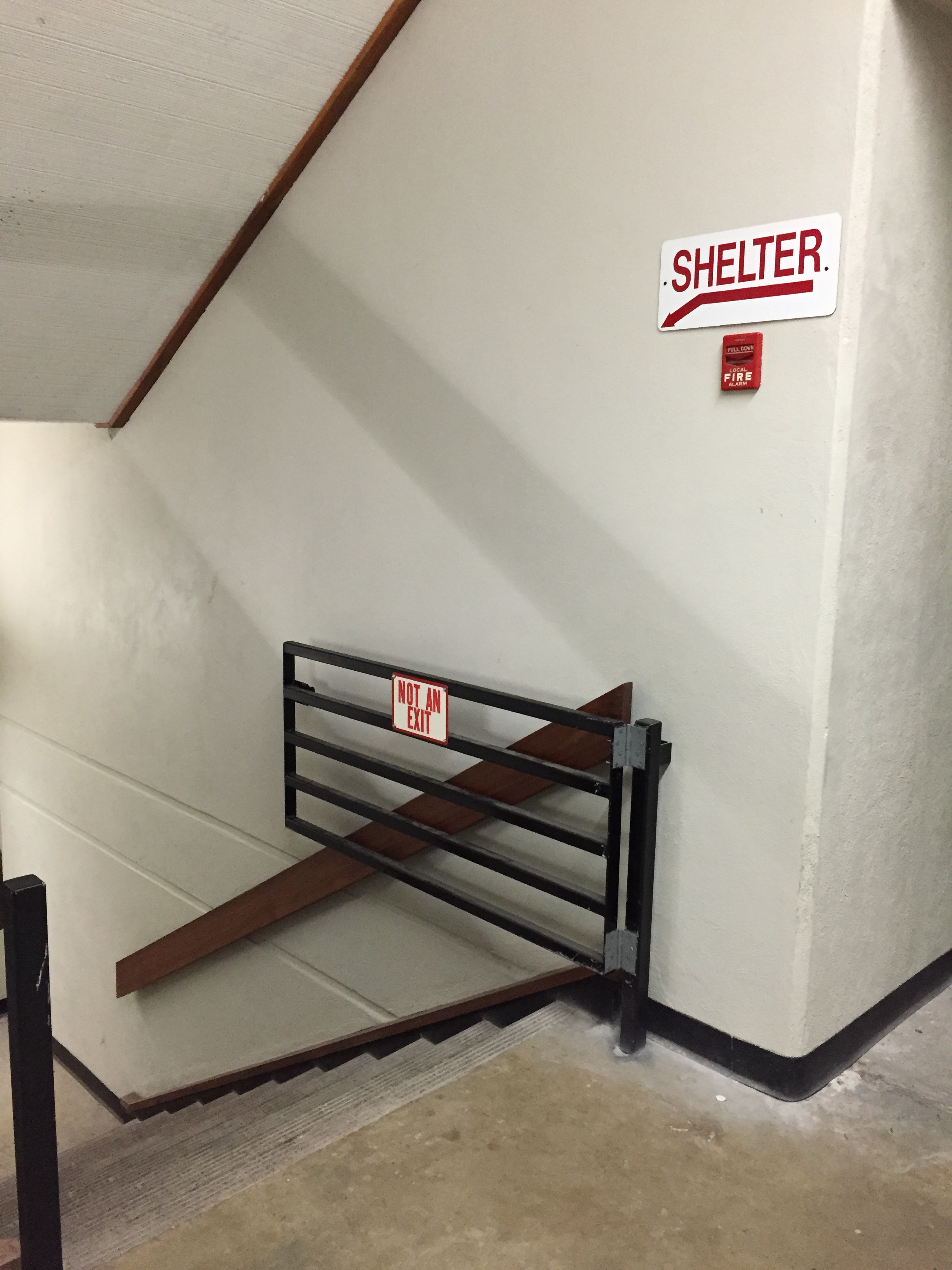 The easiest way to access the sub-basement is through the emergency exit doors in the Special Collections hallway. Follow the Shelter signs to the bottom of the stairs.