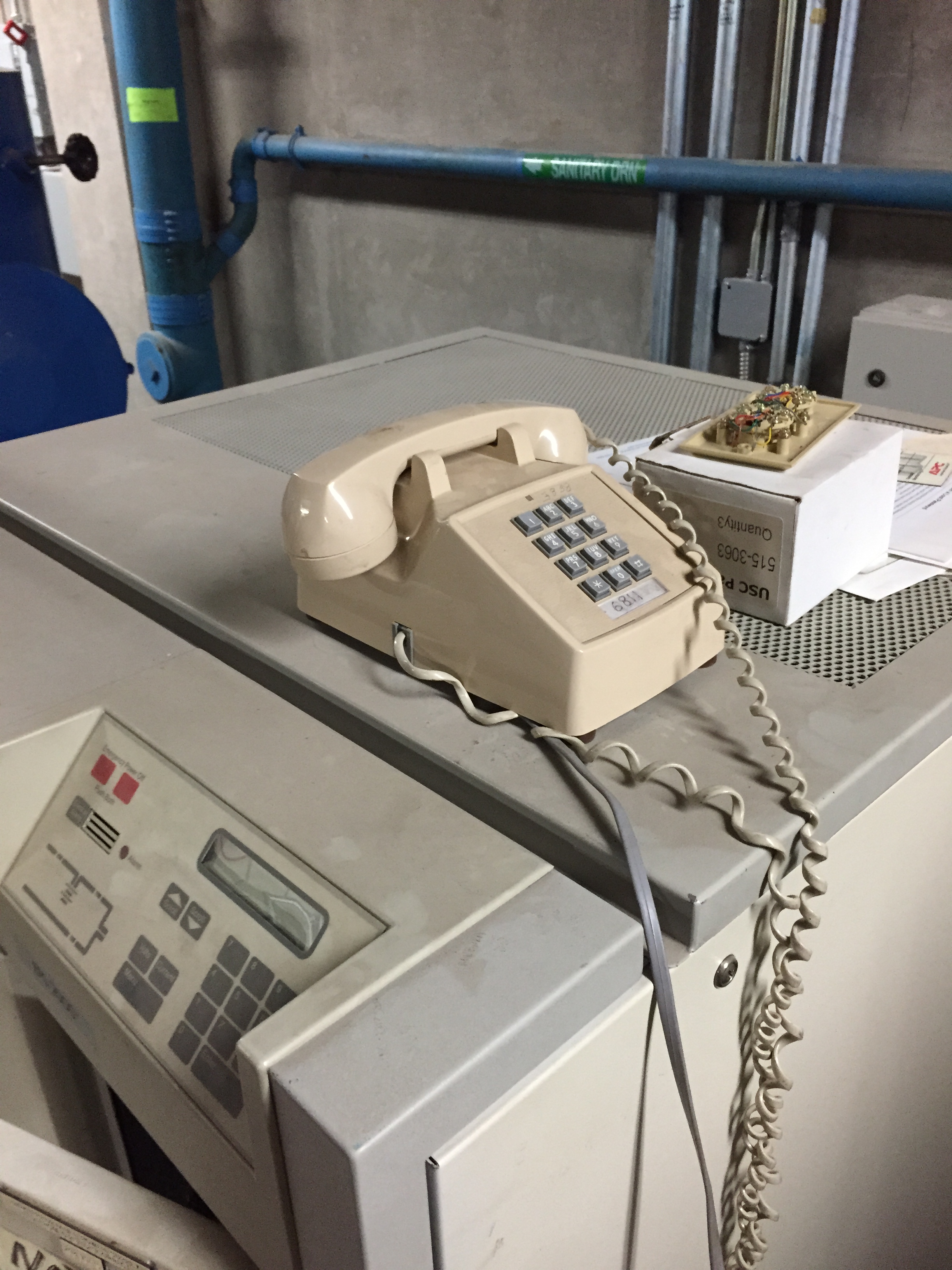 Walkie-talkies are located in the Circulation staff desk drawer and can be used to communicate with the worker in the sub-basement. A flashlight is located in the desk underneath the microphone.